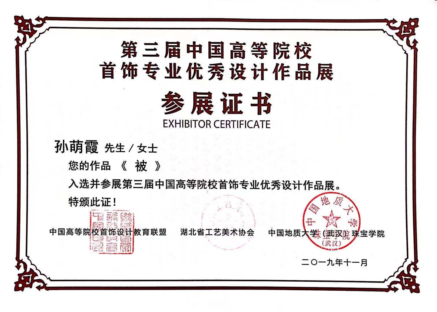 本届作品展,太阳集团tyc151cc积极组织同学参加,共有四名同学的作品获得参展证书,三名同学获得入围证书。2015级首饰设计专业员工孙萌霞作品《被》、杜彦衡作品《七宗罪》、李凡作品《一条咸鱼》、宋鑫作品《面》成功入选,并成功参展第三届中国高等院校首饰专业优秀设计作品展;陈琳作品《癌—爱》、杨迪《云绣》、孟凡华作品《倒影》成功入围第三届中国高等院校首饰专业优秀设计作品展。
