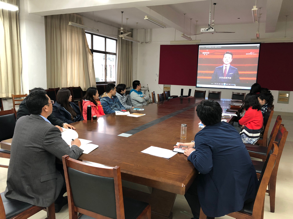 11月8日,太阳集团tyc151cc在文经楼资料室召开专题会议,继续推进解放思想大讨论活动,党总支书记梁永平主持,全院教职工集体观看专题片《平“语”近人——习近平总书记用典》第三集《国无德不兴》。