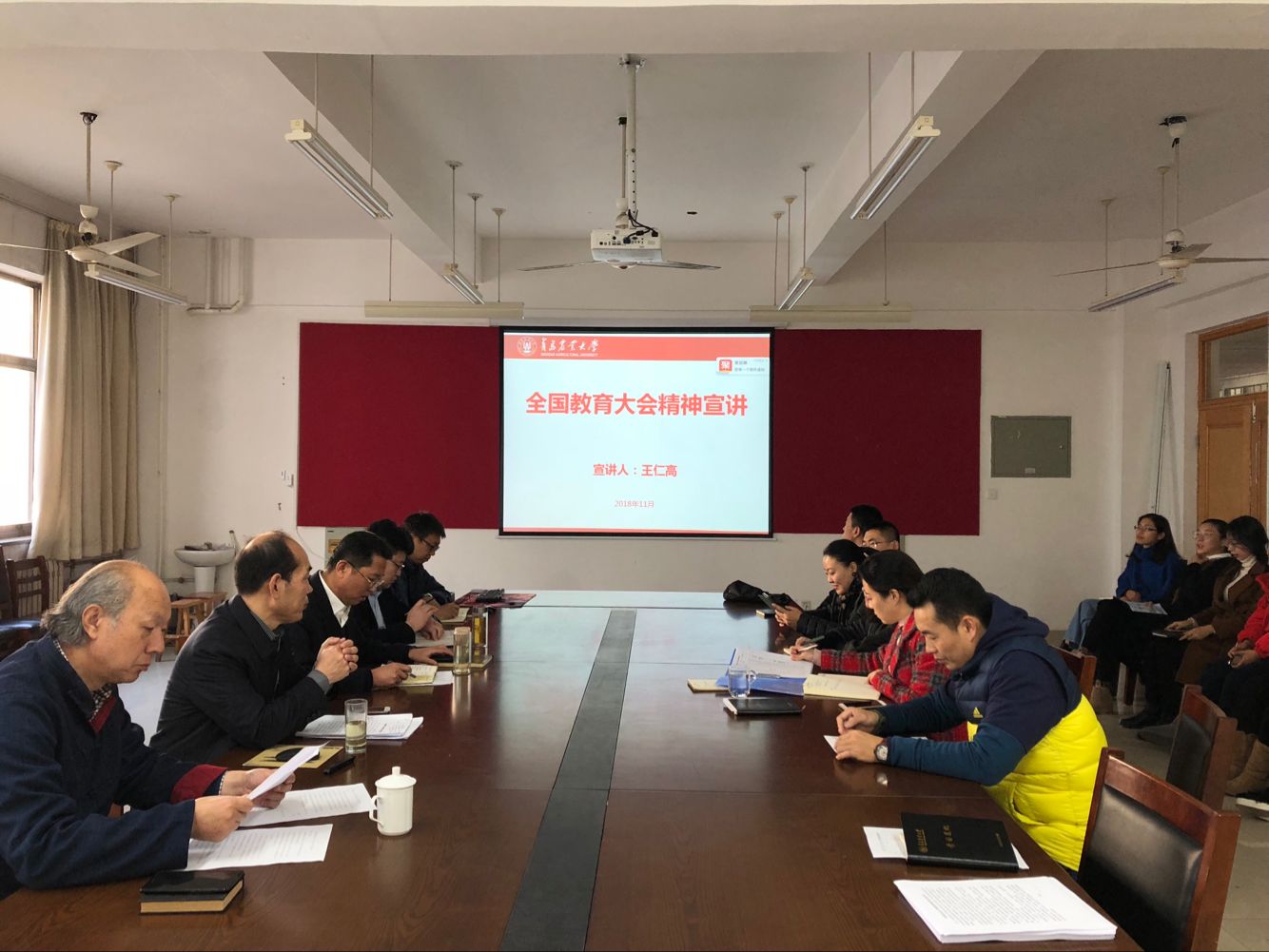 11月22日,太阳集团tyc151cc在文经楼会议室举行全国教育大会精神宣讲,邀请省全国教育大会精神宣讲团成员、外国语公司党委书记王仁高做报告,全院教职工参加。