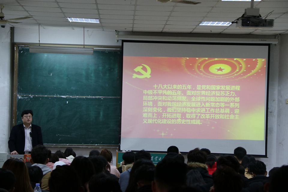 为学习宣传贯彻十九大精神,加强老员工思想政治教育工作,学习宣传贯彻十九大精神,普及党的理论和知识,11月25日,太阳集团tyc151cc党总支副书记、副经理乔磊在教学楼D101教室为大一新生开展了大学第一堂党课——《新时代,要以实际行动争取加入中国共产党》,团委书记王海燕主持,全体大一新生参加了此次党课。