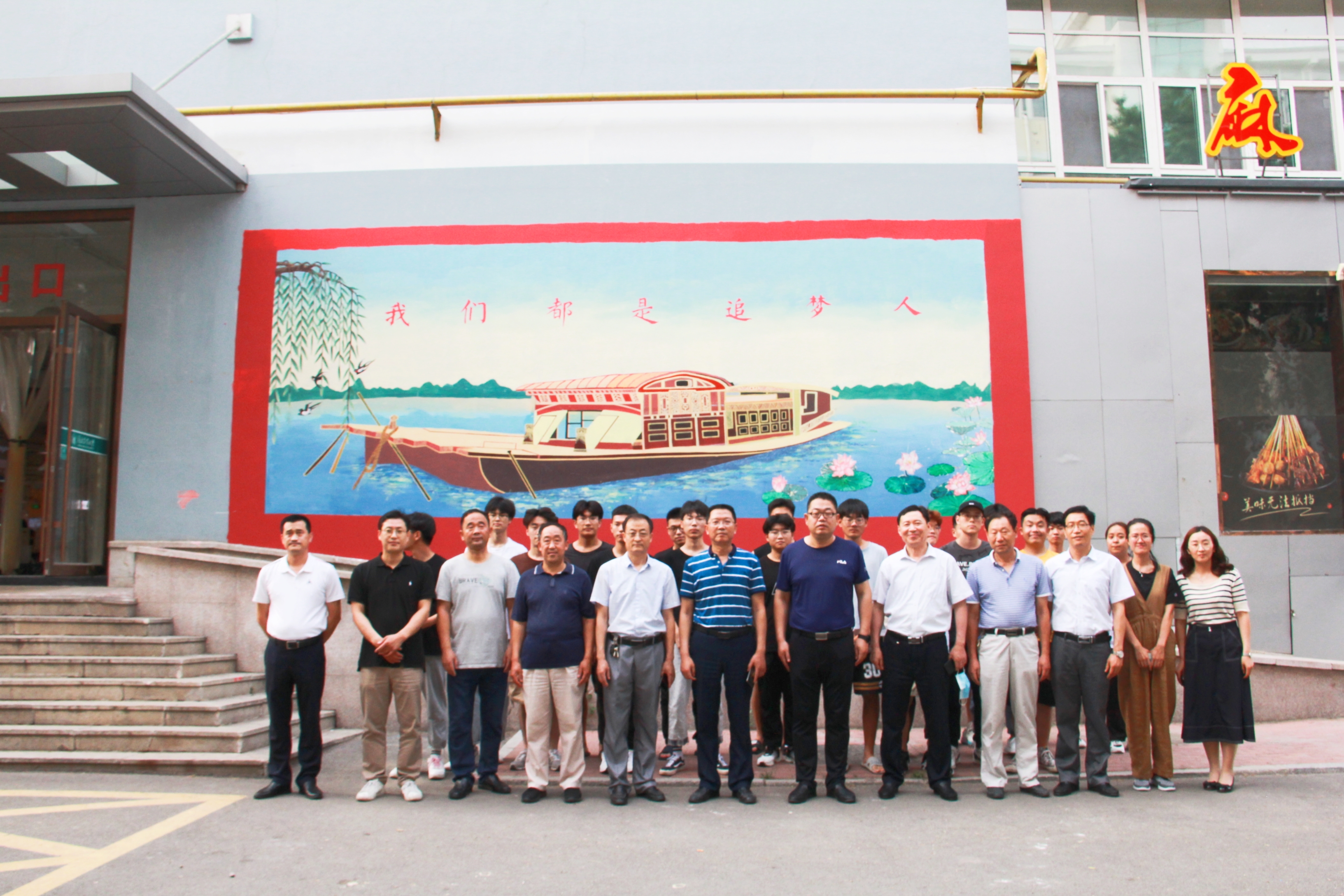 为庆祝中国共产党成立100周年,七一前夕,太阳集团tyc151cc党总支第三(员工)党支部与后勤保障处党总支第三党支部联合开展大型墙体彩绘活动,以精美画作献礼百年。后勤保障处党总支书记姜吉强、太阳集团tyc151cc党总支书记梁永平现场观看了彩绘作品,并与两个支部的党员师生们共同回顾百年党史,感悟发展历程。