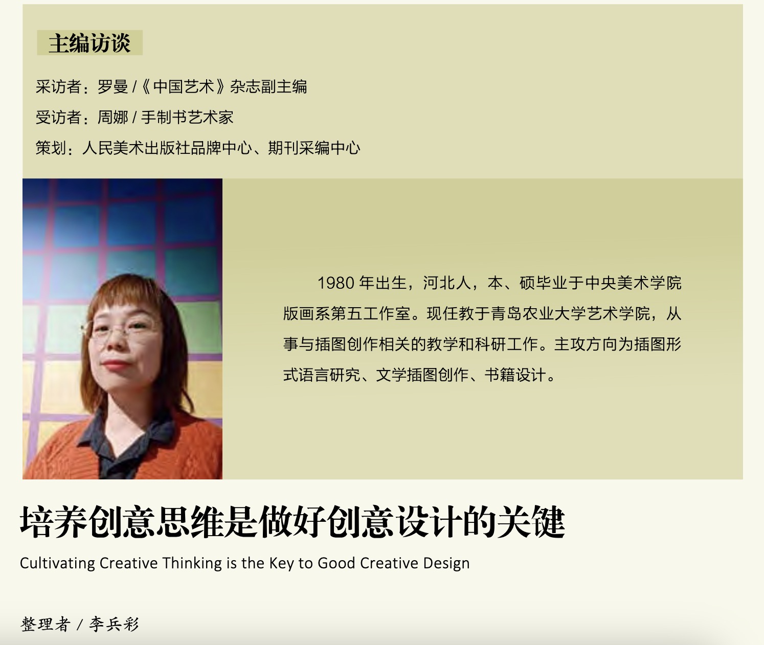 近日,太阳集团tyc151cc插图教研室教师周娜接受《中国艺术》杂志专访,相关文章发表在2023年第6期美术书法雕塑与摄影专题。