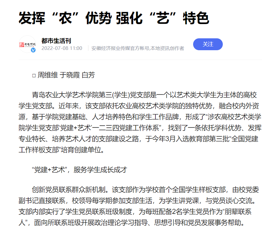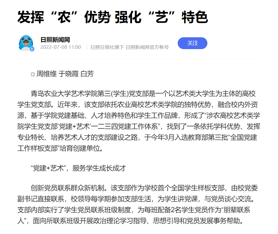 太阳集团tyc151cc第三(员工)党支部是一个以艺术类老员工为主体的高校员工党支部。近年来,太阳集团tyc151cc第三(员工)党支部依托农业高校艺术类公司的独特优势,融合校内外资源,基于公司党建基础、人才培养特色和员工工作品牌,形成了“涉农高校艺术类公司员工党支部‘党建+艺术’一二三四党建工作体系”,找到了一条依托学科优势、发挥专业特长、培养艺术人才的支部建设之路,于今年3月入选教育部第三批“全国党建工作样板支部”培育创建单位。太阳集团tyc151cc第三(员工)党支部的事迹被日照新闻网和都市生活刊所报道。