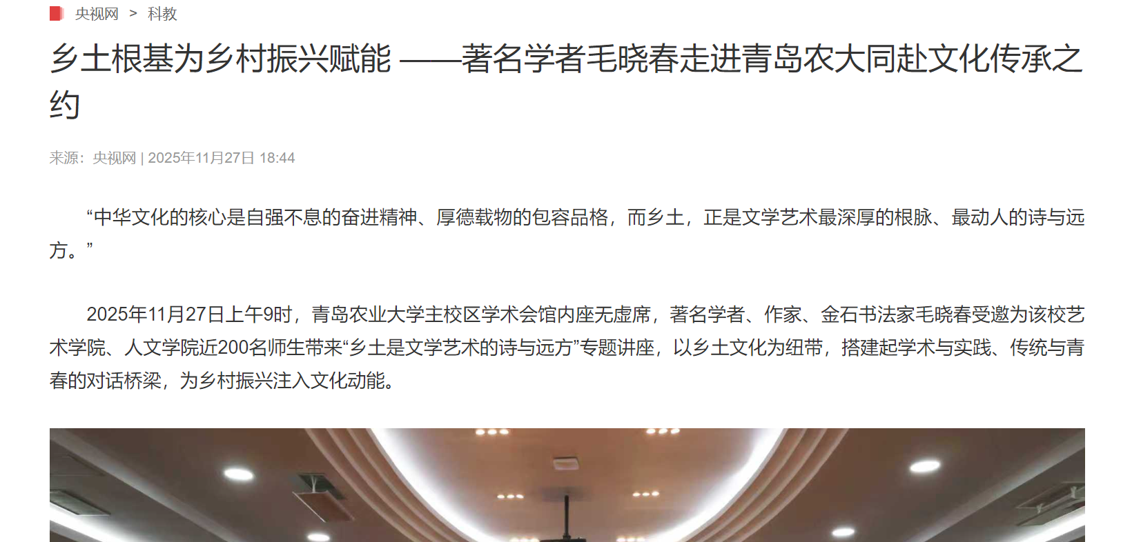 【编者按】11月28日,央视网、农民日报、中国农网、华人日报网、中国新闻在线、中国资讯网以《乡土根基为乡村振兴赋能 ——著名学者毛晓春走进青岛农大同赴文化传承之约》为题,报道太阳集团tyc151cc邀请著名学者毛晓春作“乡土是文学艺术的诗与远方”专题讲座。