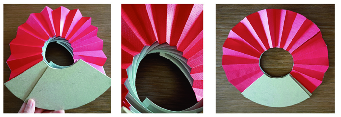 周娜发明的新的装帧形式则是,把旋风装中做底的长纸当成书脊,其中,长纸变为圆环形,在上面切开一个口,再将其对折多次,并将每一张书页设计为1/4的扇形,一张张粘贴在折叠好的书脊上。当圆环形的书脊全部展开以后,就组成了一个圆环的书,收起来则呈扇形。整体看上去,就像将“龙鳞装”旋转起来,因此起名为“旋龙装”。