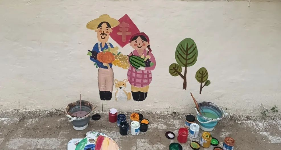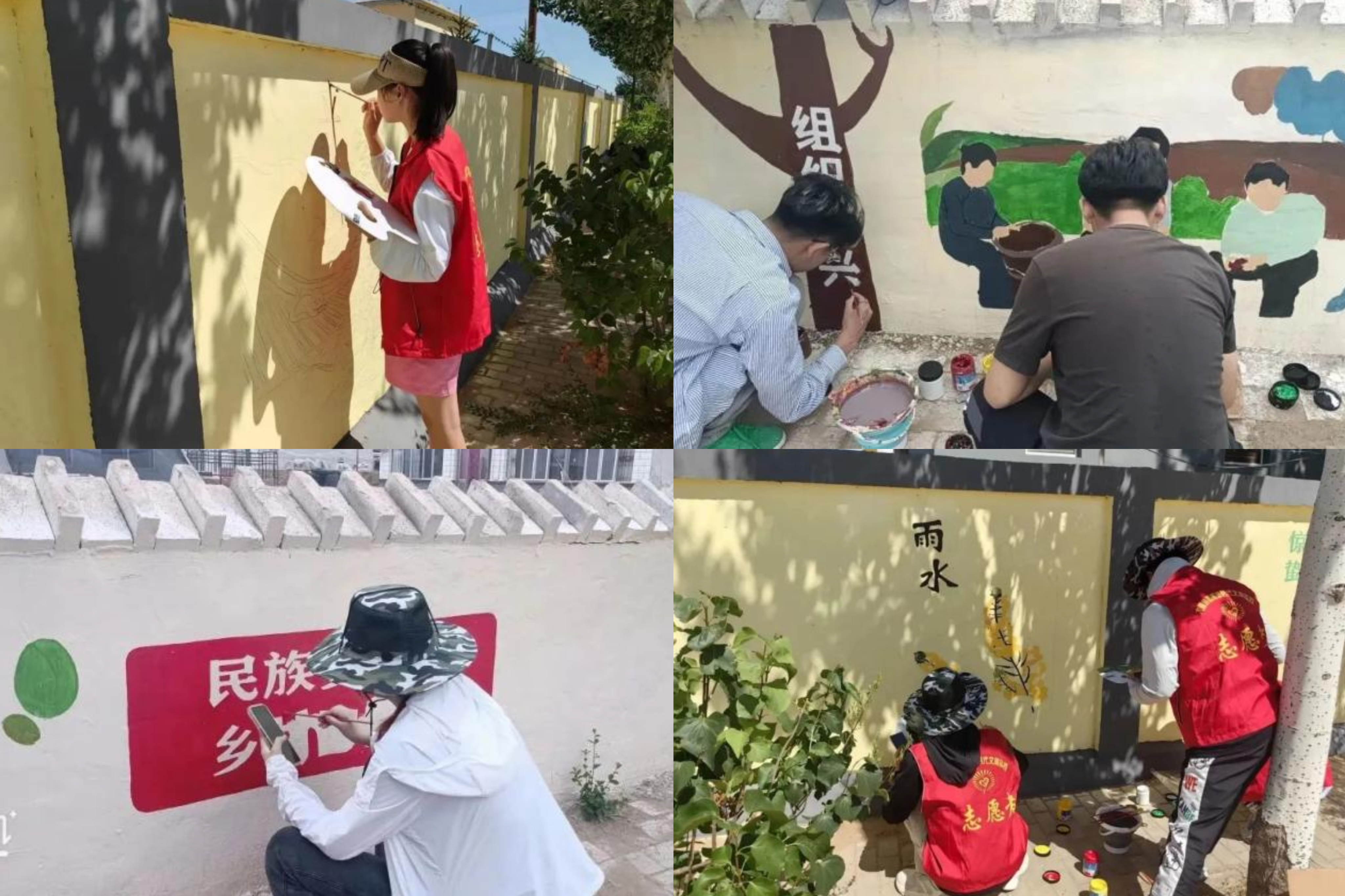 炎炎夏日,老员工们走访研究了村内的墙面,认真分析了两个村的实际情况,根据美丽乡村建设的总体规划,他们一手端颜料、一手持画笔,调色、描边、勾线、上色,把乡村振兴、社会治理、传统文化等内容生动地展现在墙体上。路过的群众们赞不绝口,原本单调的墙体趣味十足,焕发出蓬勃朝气。志愿服务队短短几天时间,完成了17面墙体作品,每幅作品都展现出了嘎查村的新生活、新气象、新面貌。