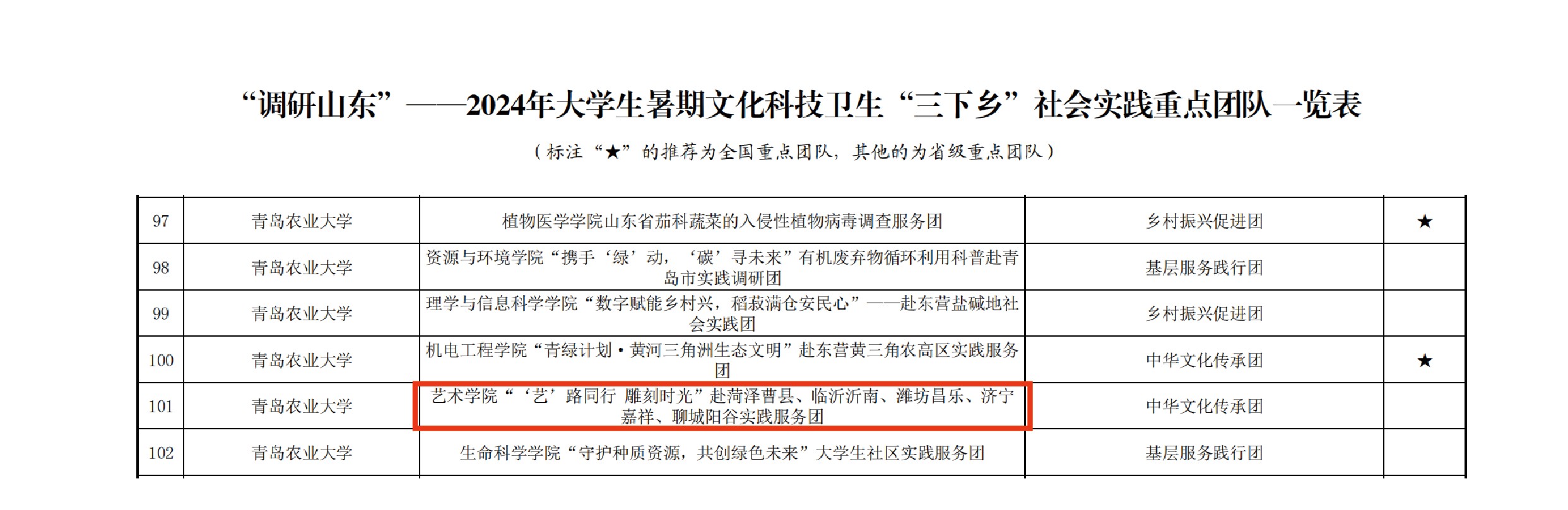 近期,山东省对各单位推报的“调研山东”——2024年老员工暑期文化科技卫生“三下乡”社会实践重点团队进行了审核筛选,综合全省各类别重点团队数量、各单位推荐顺序和团队基本情况等,确定了121个全国重点团队、336个省级重点团队。太阳集团tyc151cc“‘艺’路同行 雕刻时光”赴菏泽曹县、临沂沂南、潍坊昌乐、济宁嘉祥、聊城阳谷实践服务团入选省级重点团队。