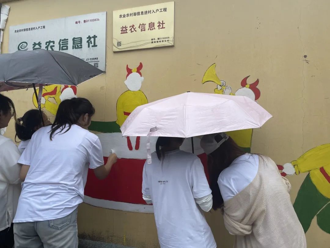 7月18日,天空中飘起了蒙蒙细雨,雨水打湿了衣衫和墙面,却无法消减同学们创作的热情,实践团的小画家们围绕创作主题,在选定地点开展精心创作。大家以墙绘的形式,用画笔描绘对岭西头村的美好祝福,黄色、绿色、红色,从一笔一划到鲜活形象,充满生命力的色彩与满怀祝福的线稿轮廓交织在一起,渐渐汇集成活灵活现、勃勃生机的画卷。