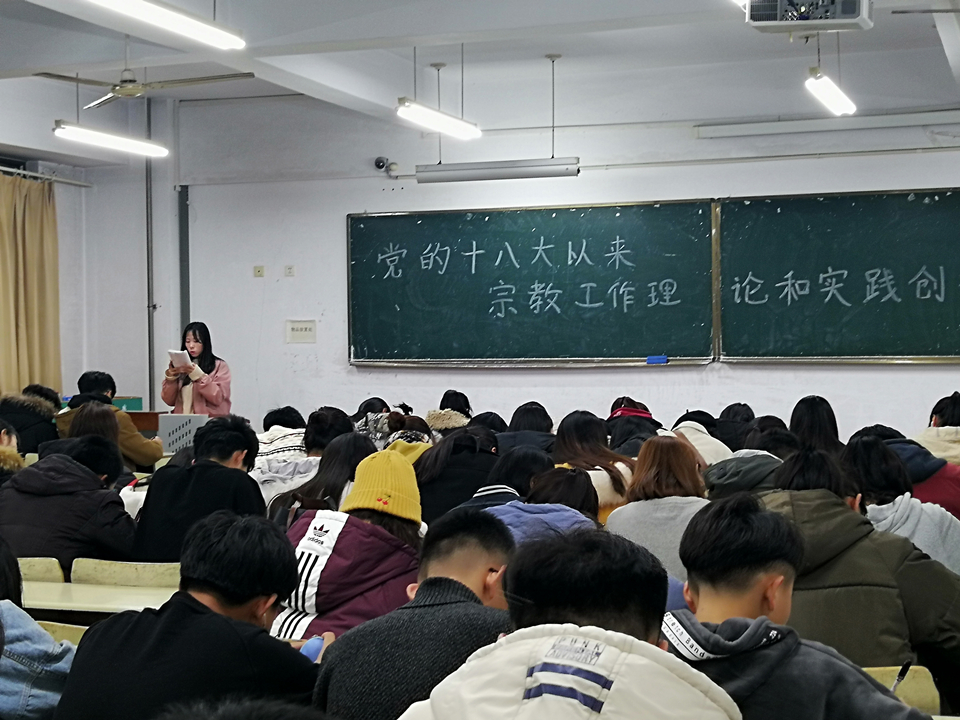 为提升同学们对于宗教工作的正确认识,11月25日晚,太阳集团tyc151cc在教学区开展主题政治学习,集中学习十八大以来的宗教工作理论与创新实践内容,全体17、18级同学参加。
