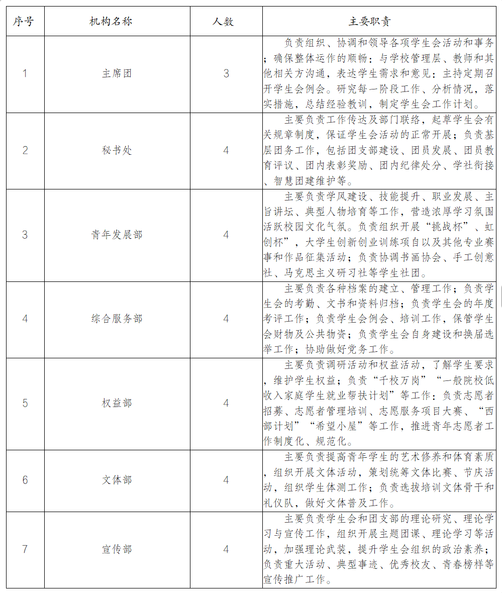 (一)遵循和贯彻党的教育方针,组织同学开展学习、文体 、社会实践、志愿服务、创新创业创等多种活动,促进同学德智体美劳全面发展,团结和引导同学成为热爱祖国,适应中国特色社会主义事业要求的合格人才,进一步增强对中国特色社会主义的道路自信、理论自信、制度自信、文化自信, 自觉树立和践行社会主义核心价值观,为实现中华民族的伟大复兴而努力奋斗;