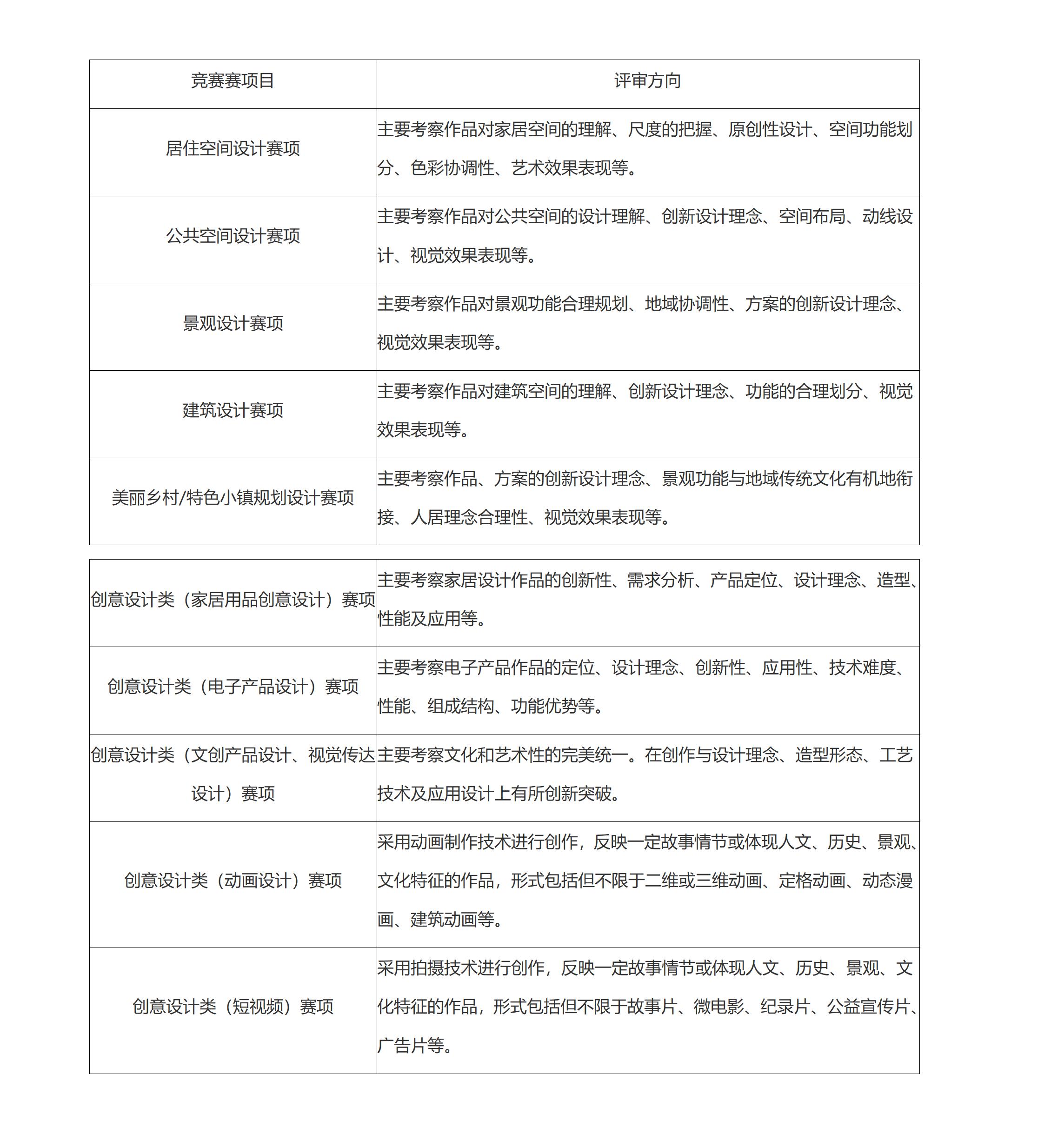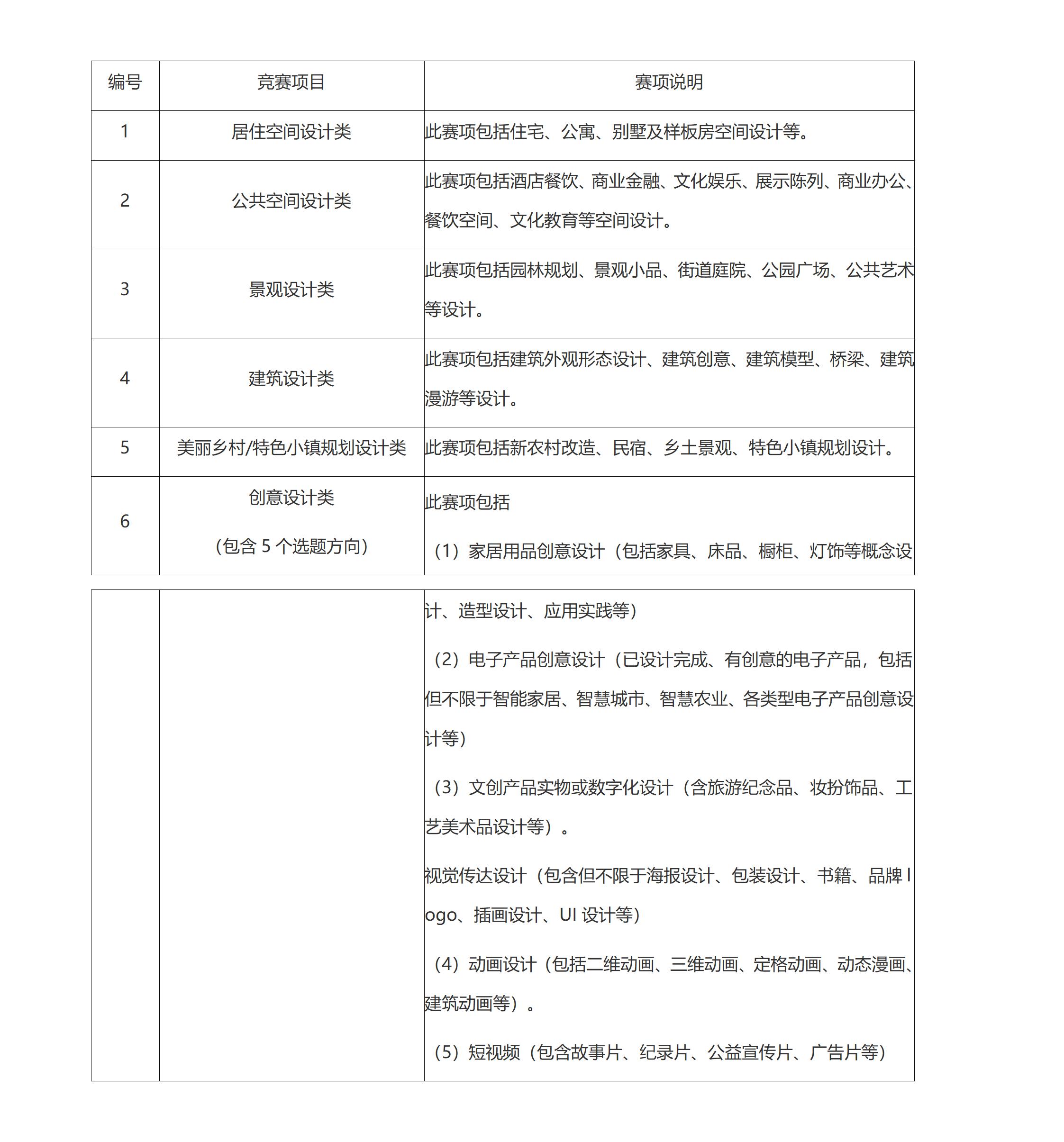本次大赛主要以环境艺术设计创意方案为主,包括居住空间设计类、公共空间设计类、景观设计类、建筑设计类、美丽乡村/特色小镇规划设计类、创意设计类。具体竞赛项目及说明见下表:
