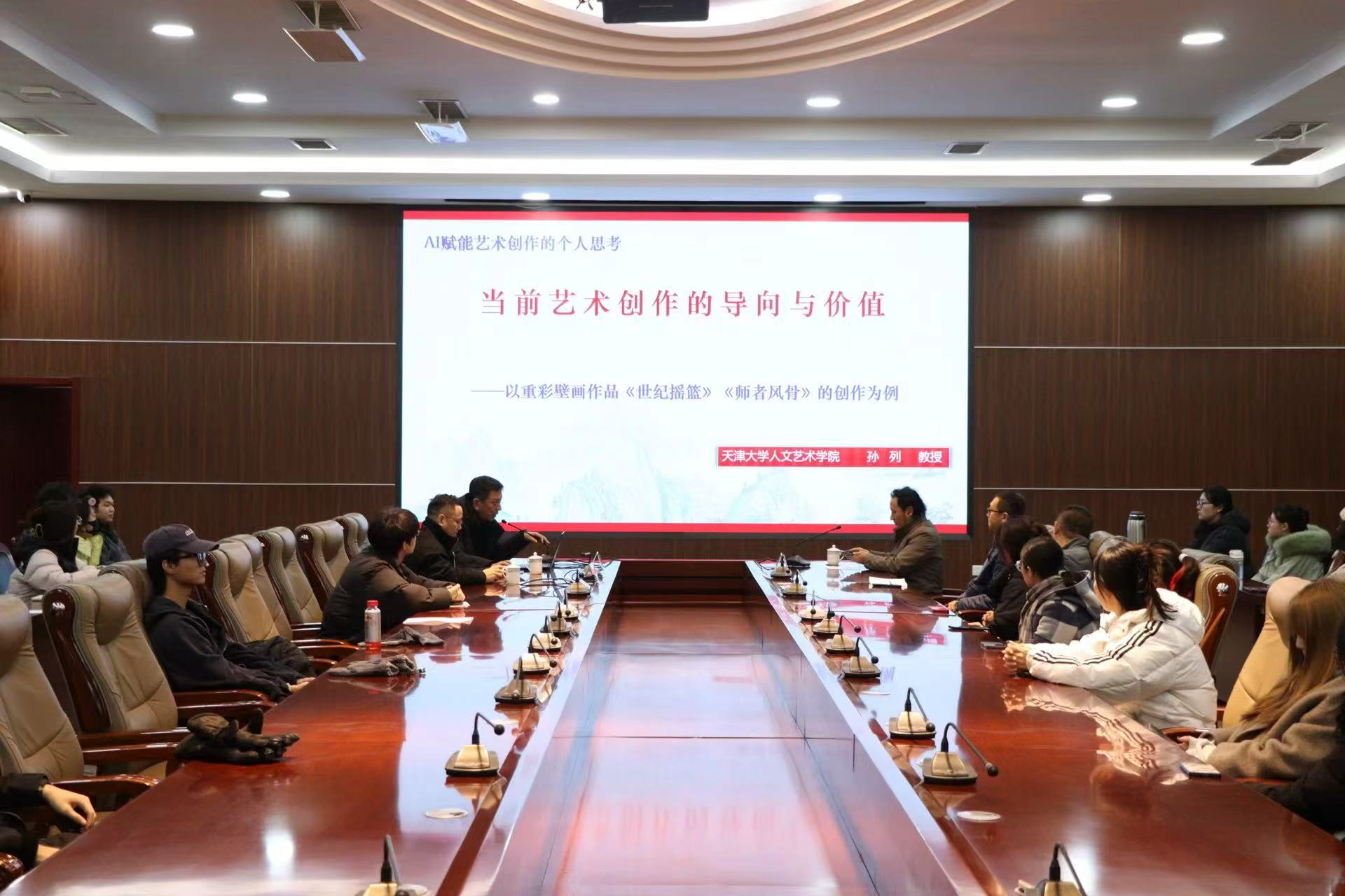 天津大学人文太阳集团tyc151cc经理助理、硕士生导师孙列教授围绕“AI赋能主题性美术创作”与“当前艺术创作的导向与价值”作专题报告。报告结合其主持的国家重大课题及《世纪摇篮》《天大风骨》等大型壁画创作实例,阐述了艺术创作扎根人民、呼应时代的根本原则。报告分析了AI技术在辅助创作中的实际作用与局限,强调人类情感、意识与价值判断是艺术创作不可替代的核心。