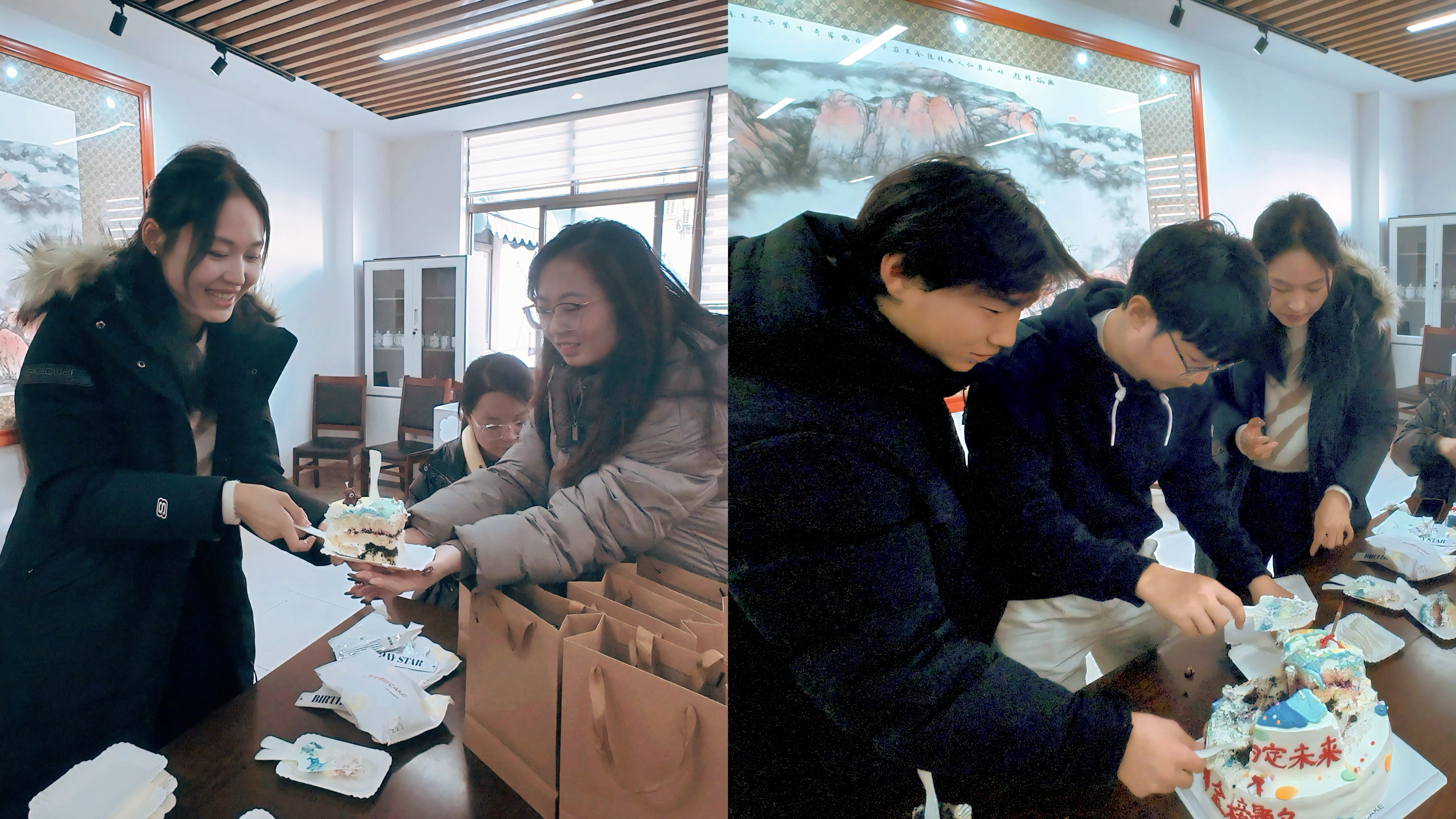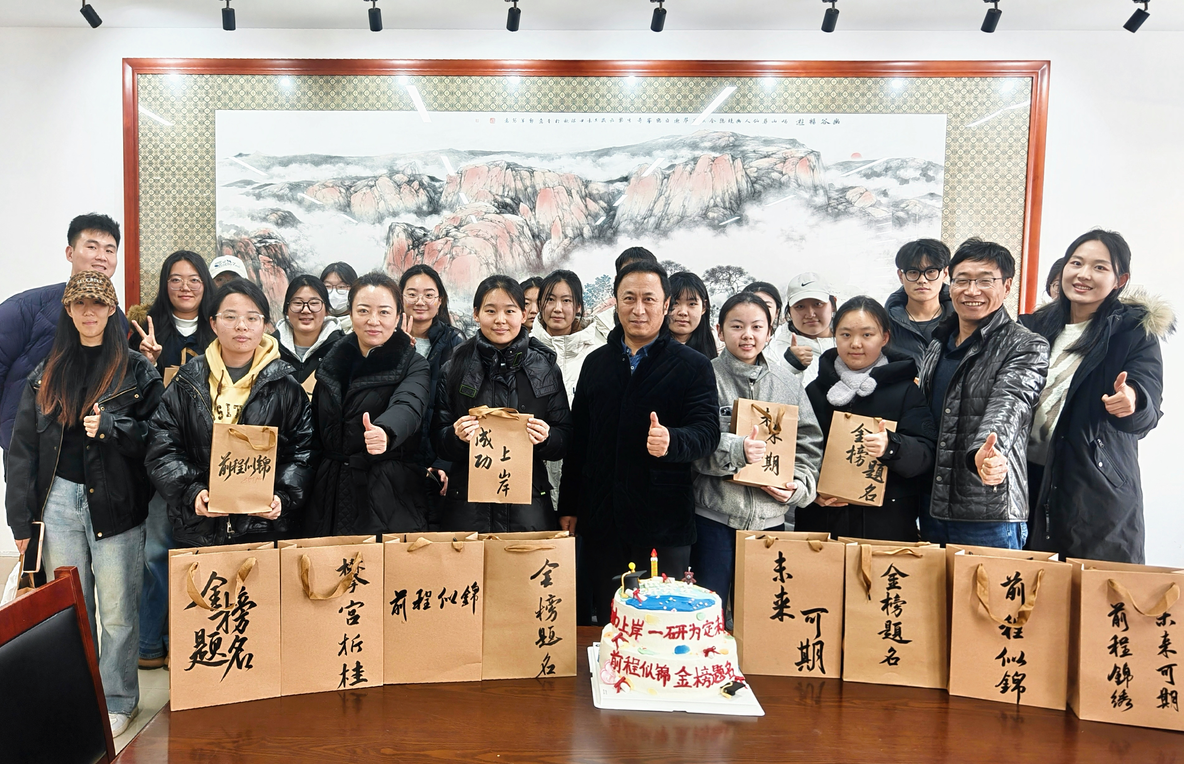 李慧斌代表公司慰问备考员工,结合艺术学科特色和冲刺阶段特点分享备考策略与心态调整方法,勉励大家坚定信念、沉着应考,将长期积累的实力转化为笔下的从容。此外,公司为同学们准备了暖心礼物,2023级员工在礼物袋上亲笔书写“前程似锦”、“未来可期”等暖心祝福语并到场给学长学姐送上祝福,师生共同分享寓意美好的蛋糕,现场气氛温馨。