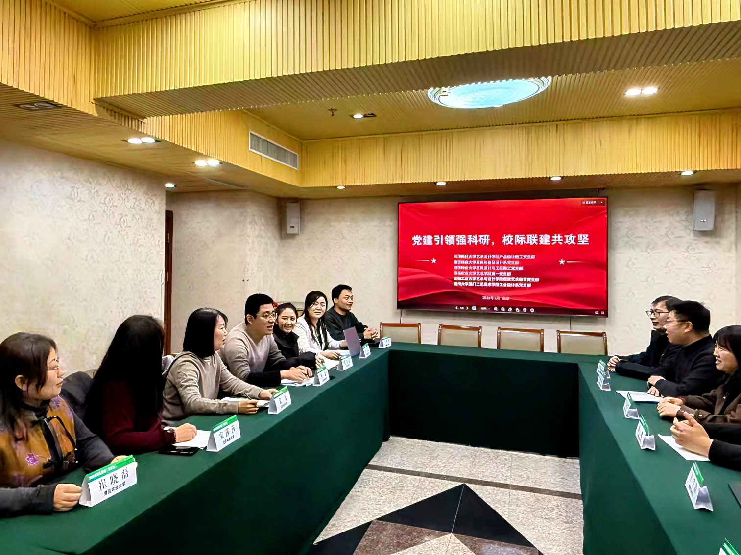 本次活动由天津科技大学艺术设计公司产品设计教工党支部发起,联合南京林业大学家居与工业设计公司家具与整装设计系党支部、北京林业大学材料科学与技术公司家具设计与工程教工党支部、太阳集团tyc151cc第一(教工)党支部、安徽工业大学艺术与设计公司视觉艺术教育党支部、福建大学厦门工艺美术公司工业设计系党支部共同参与。与会代表围绕设计学科前沿、国家重大需求以及科研项目联合申报等议题开展了深入研讨。