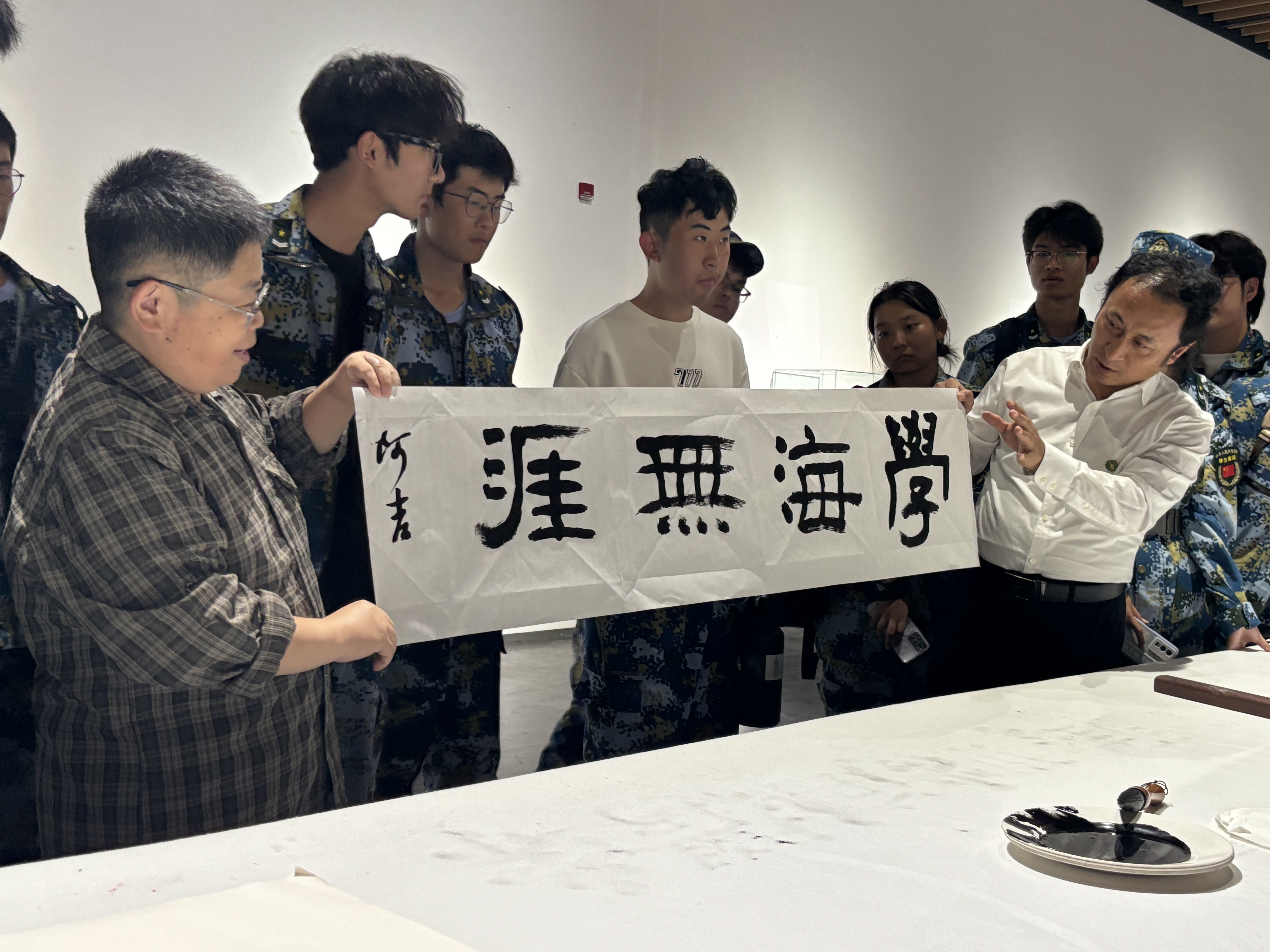活动还安排了师生互动环节,李慧斌经理在现场挥毫泼墨,书写院训“崇德尚艺”四个大字,并用生动有趣的故事拉近与员工之间的距离,引发员工对中华传统文化的兴趣和重视。宋吉昊老师也进行了书法展示,题写“学海无涯”,勉励新生打好专业基础,做好职业规划,以青春洋溢之姿态度过多彩老员工活。