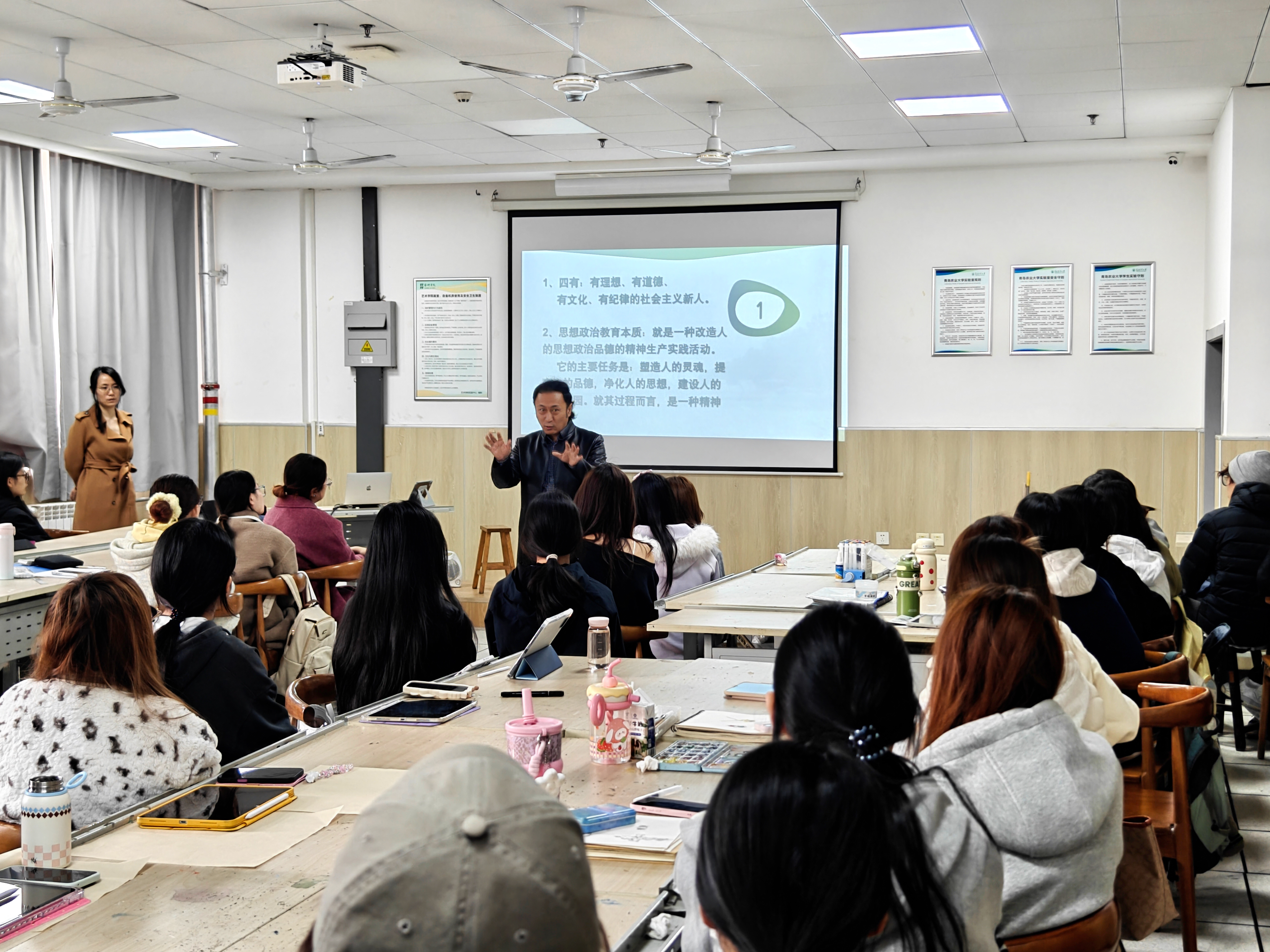 同日,经理李慧斌在教学楼以《崇德尚艺、矢志三农:做新时代的艺术创新人才》为主题面向员工开讲。他从“坚定理想信念、强化实践担当、规划成长路径”三个方面展开,结合学习贯彻习近平总书记重要讲话精神,阐释了艺术人才服务国家战略的时代使命。他以公司参与的莒南县朱芦镇乡村振兴设计项目为例,生动展示了艺术设计赋能乡村建设的实践成果,鼓励员工将专业理论与创作实践、艺术探索与服务“三农”紧密结合,在学习中增长本领,在实践中锤炼品格,努力成长为堪当民族复兴大任的时代新人。