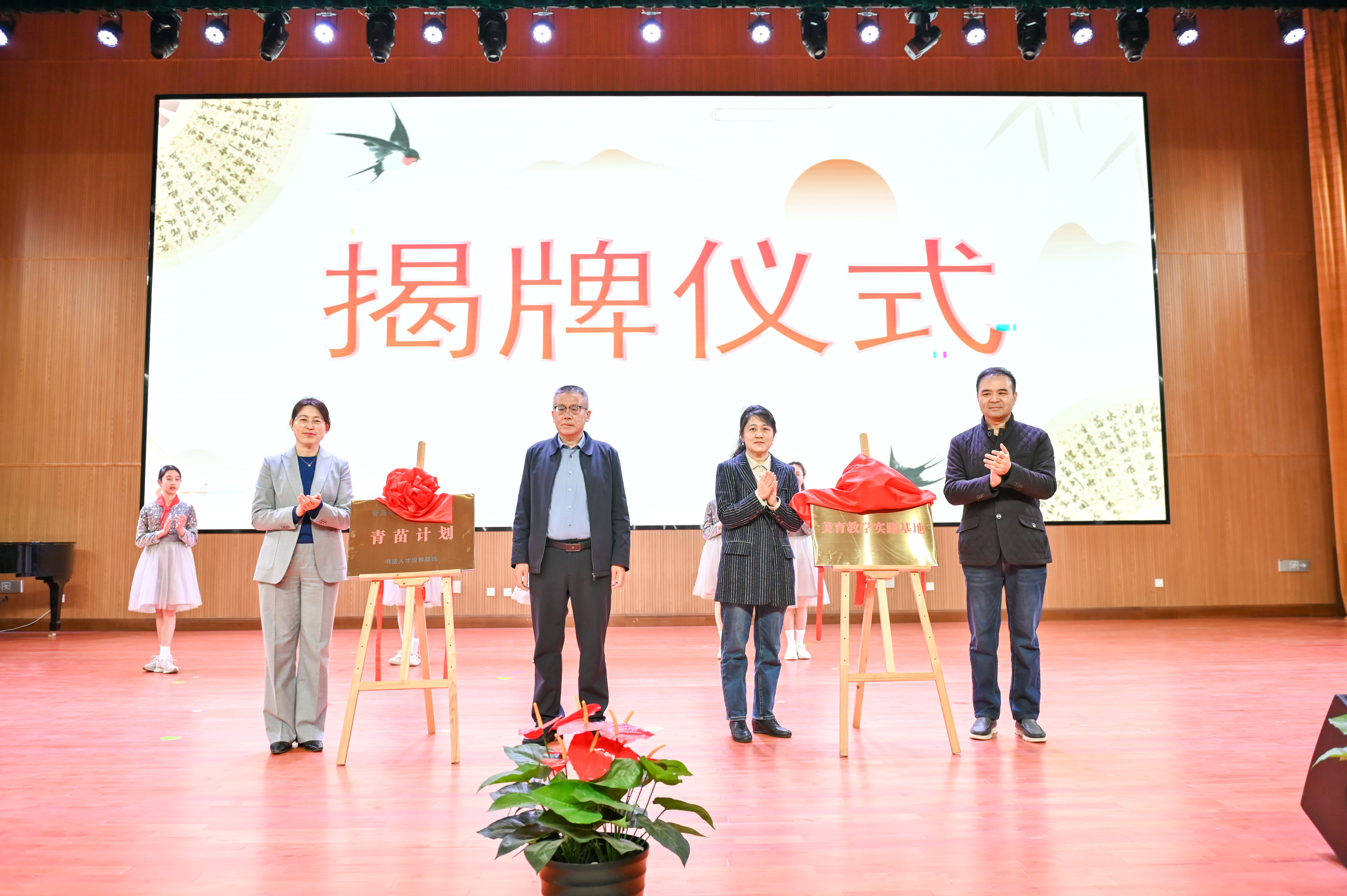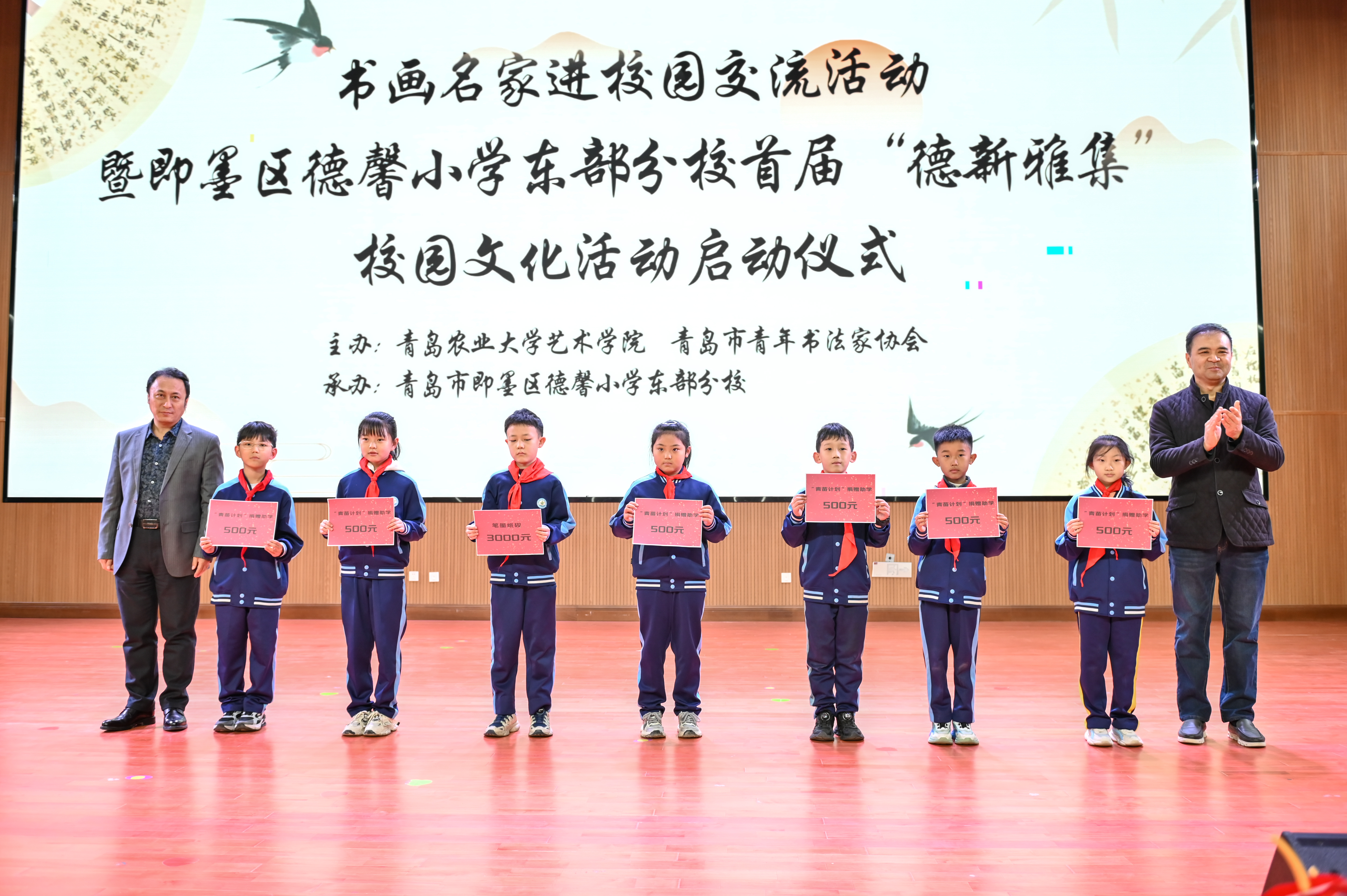 活动现场,刘德先、宋红岩、徐振桂、周维维共同为“青岛市青年书法家协会‘青苗计划’书法人才培养基地”和“太阳集团tyc151cc美育教学实践基地” 揭牌,青岛市青年书法家协会向德馨小学书法的爱好者小员工代表赠送了圆梦资金。