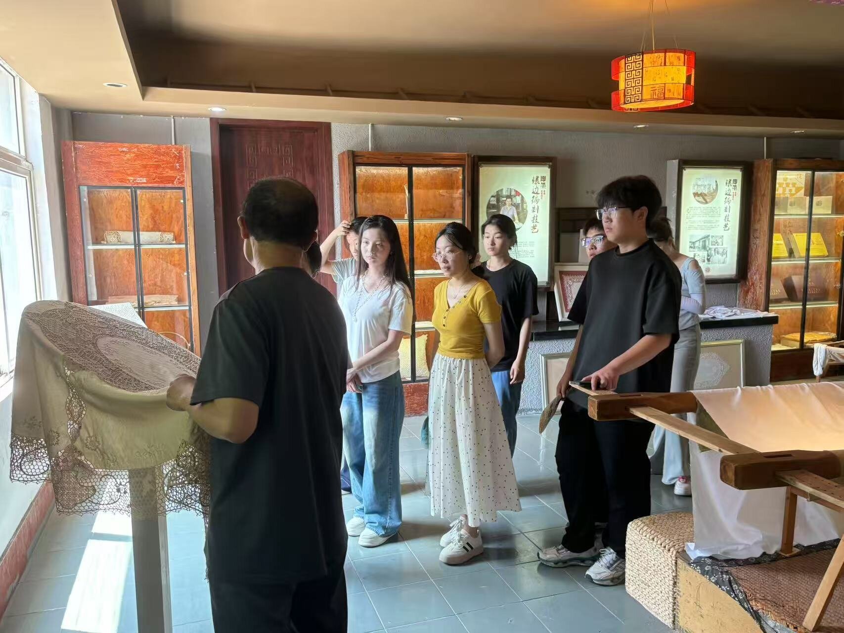 7月24日,“知行先锋”实践服务团赴青岛非遗博览园,考察即墨花边、草编等非遗项目。同学们与手艺人面对面交流,聆听非遗传承故事,了解编织技法、针法技艺以及传承困境与创新尝试。队员们将产品设计等专业知识融入调研,用手绘还原编织步骤,构思文创方案,让专业能力成为激活传统工艺活力的钥匙,助力探索非遗创造性转化和创新性发展中的有效路径。